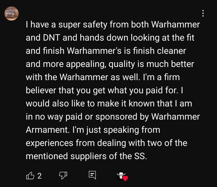 War Hammer Armaments offers 12 month warranty on all super safety products, parts, and work.